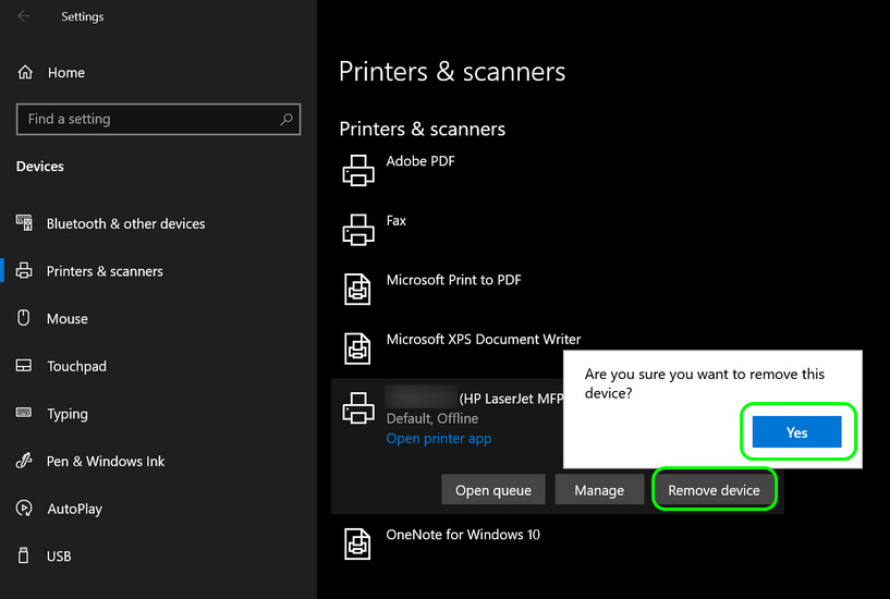 Remove Device in Printers and Scanners - Then confirm to remove the device and wait till the device is removed.