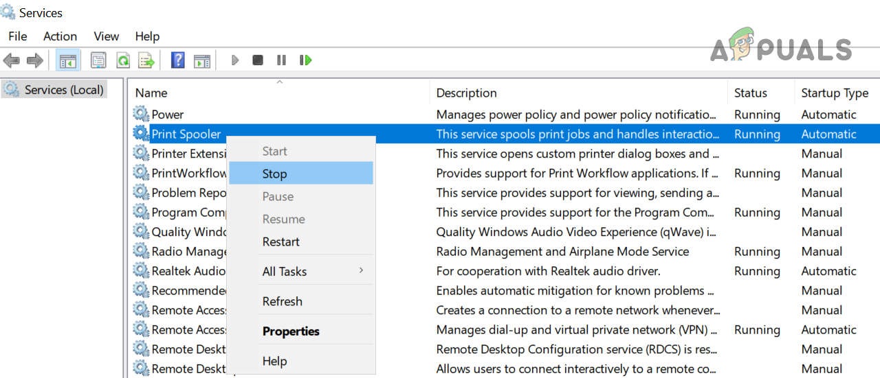 - Now, in the Services window, right-click on the Print Spooler service and select Stop.