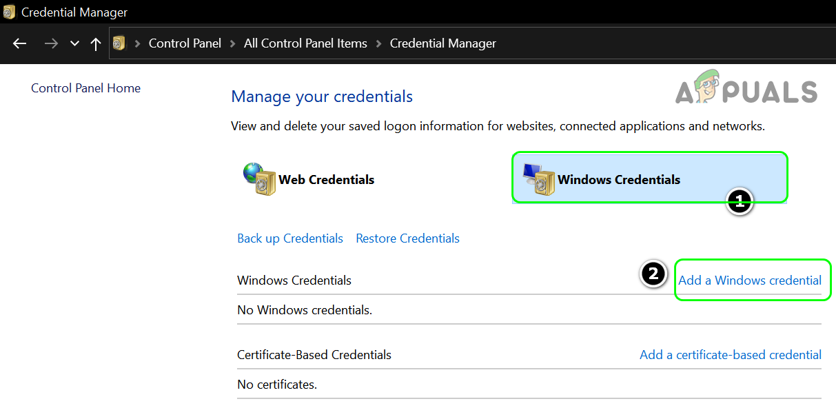 Open Credential Manager - Then head to the Windows Credential tab and click on Add a Windows Credential.