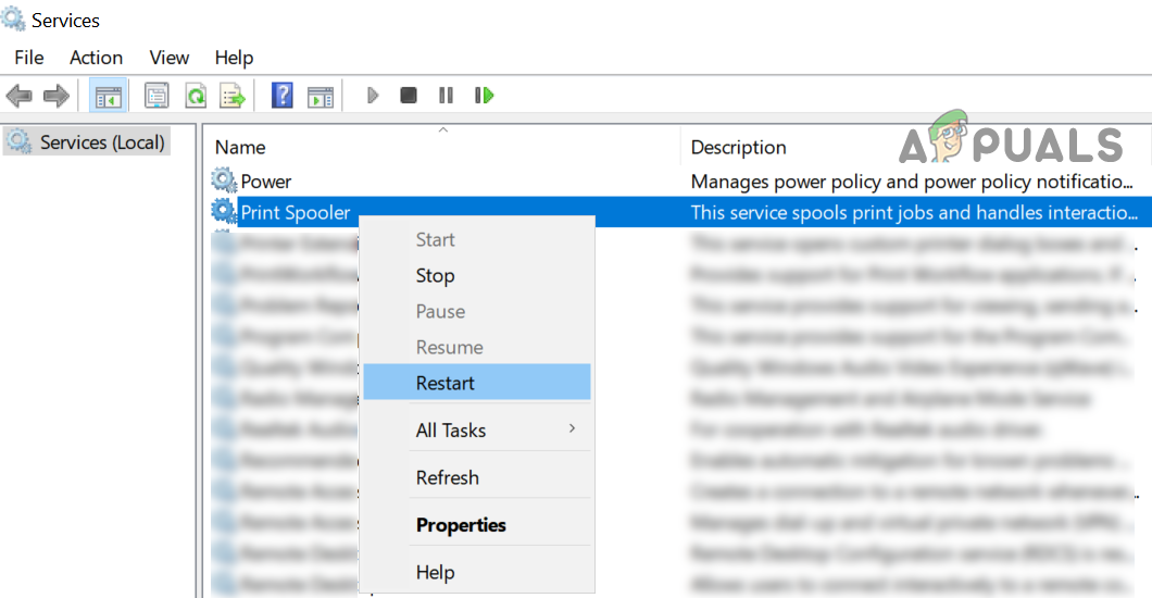 - Now, right-click on the Print Spooler service and select Restart.