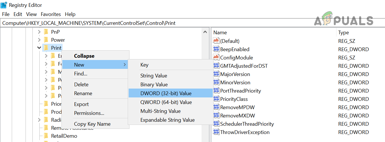 Create a New DWORD (32-bit) Value Under the Print Key - Now, in the left pane, right-click on the Print key and select New>> DWORD (32-bit) Value.