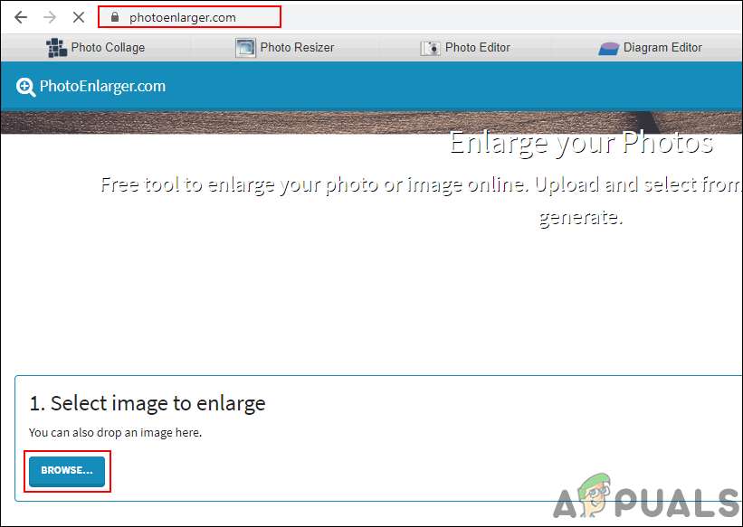 - Open your browser and go to Photoenlarger site. Click on the Browse button and open the image for increasing the resolution.