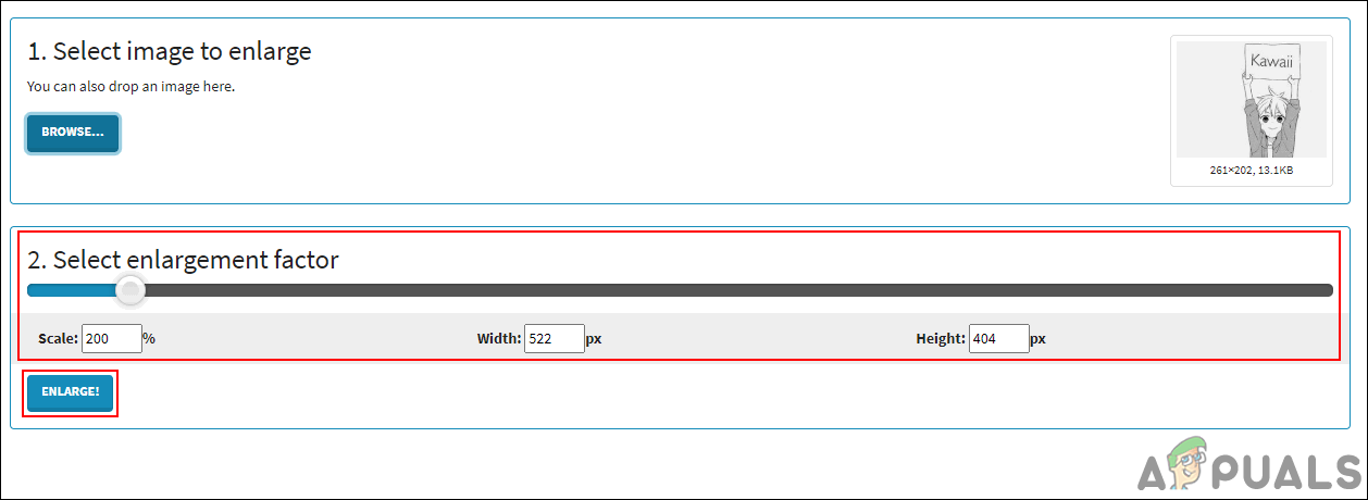 Opening the image in the site - Now change the Enlargement factor by moving the bar or typing the size in the boxes manually to your need. Once you are done, click the Enlarge button to get the result.