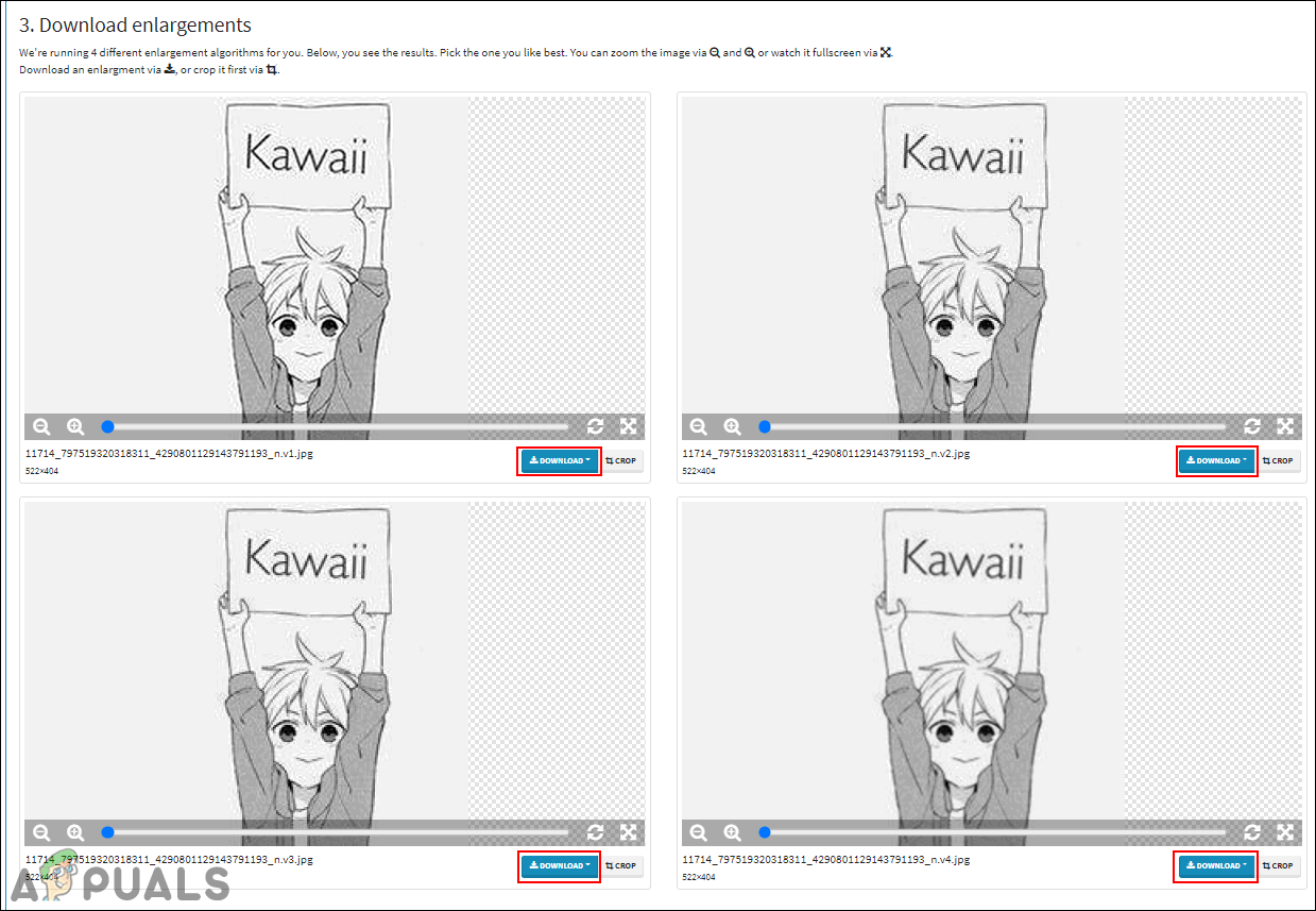4 different kind of quality enlargement - You will get the image downloaded to your system Download folder.