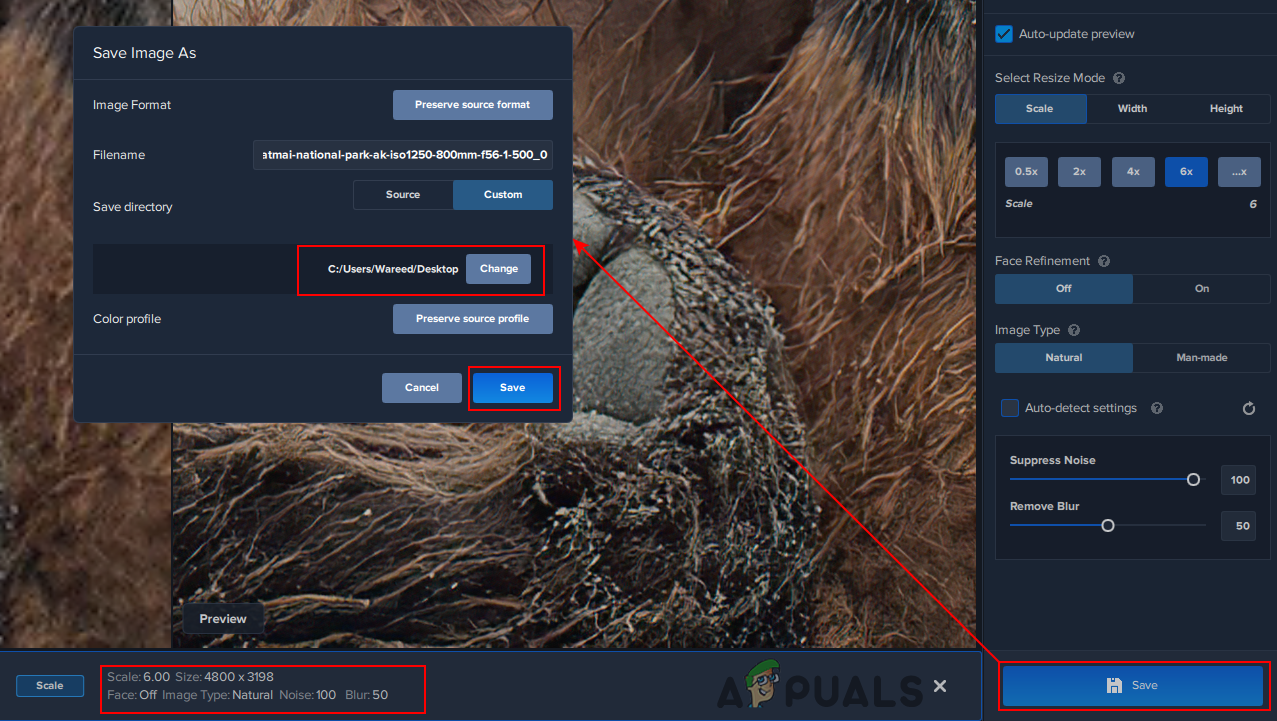 Opening the image in Gigapixel AI - Once the image is opened, you will be able to select the size through scale or width and height. Select the settings according to your needs.