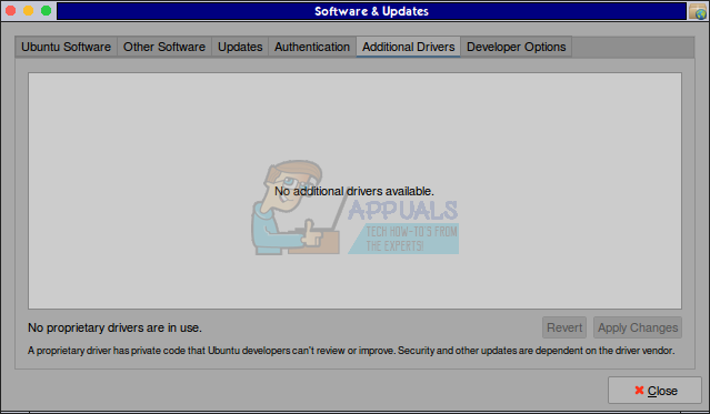 Wait a few moments if you’ve selected a driver so that it can install. You’ll receive a message that installation has completed. Click on the close button to exit the window. Should the gksu prompt have come up at any time during this process, then you can simply use your normal administrator password and the enter key to proceed. Please note that users of Free Software Foundation approved Linux distributions won’t have this option. Those who use Trisquel or Fedora will have to immediately move on to Method 4 in order to proceed.