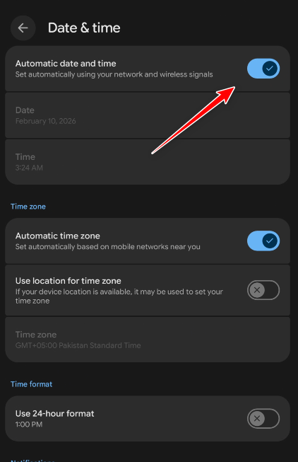 - Android: Settings > System > Date & time > enable Set time automatically.