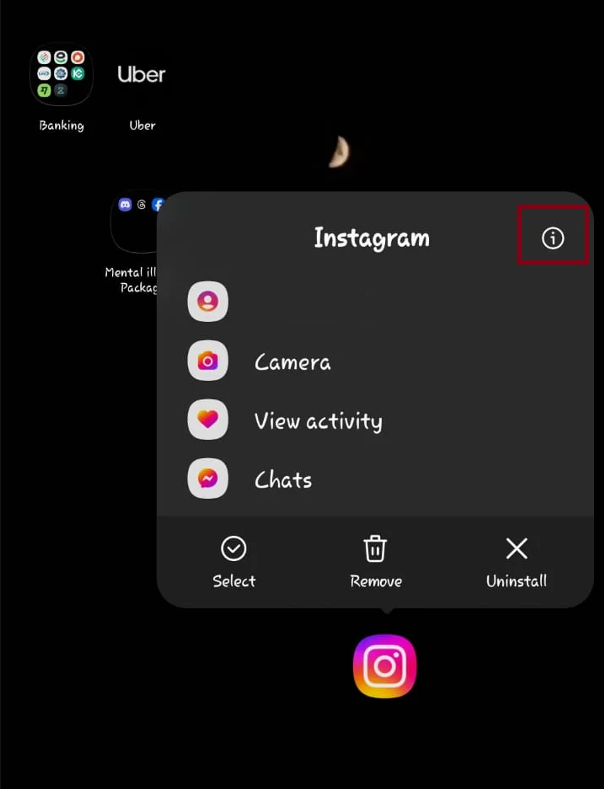 - Long-press the Instagram app icon and tap the Info icon at the top right.