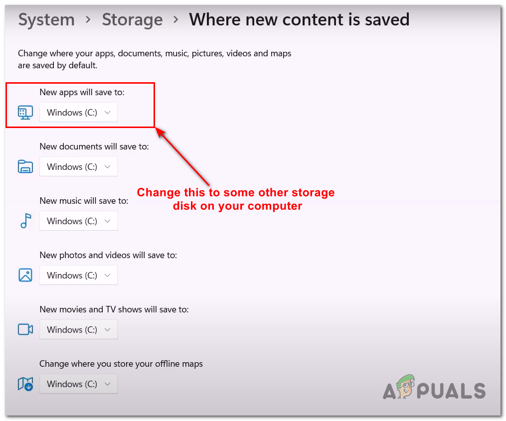 - Change the New apps will save to setting from Local Disk C: to some other storage disk on your computer.