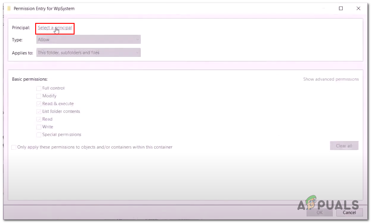 Renaming the WPsystems and Windows apps folder. - Now, Click on Select a principal.