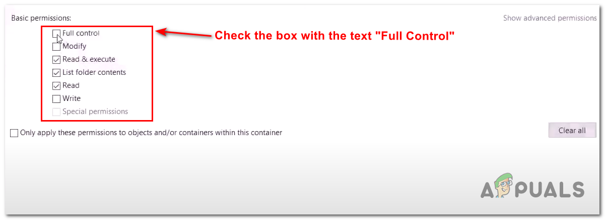 - Check the Full control box and click on apply, and hit OK.