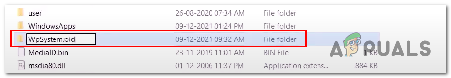Renaming the WPsystems and Windows apps folder - Now, rename the WPsystems folder to WPsystems.old.