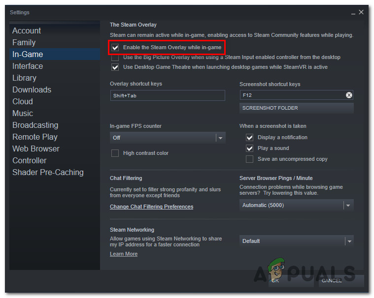 Accessing the Settings menu of Steam - Once you’re inside the Settings menu, click on In-Game tab from the menu on the left, then move over to the right-hand side and check the box associated with Enable the Steam Overlay while in-game.