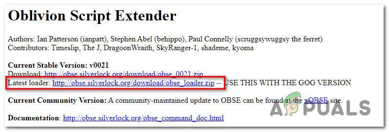 - Next, open your default browser, visit the official download page of Oblivion Script Extender and click on the link associated with Latest Loader.