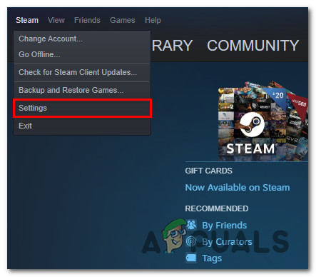 - Once you have successfully signed in with your credentials, click on Steam from the ribbon bar at the top, then click on Settings from the context menu that just appeared.