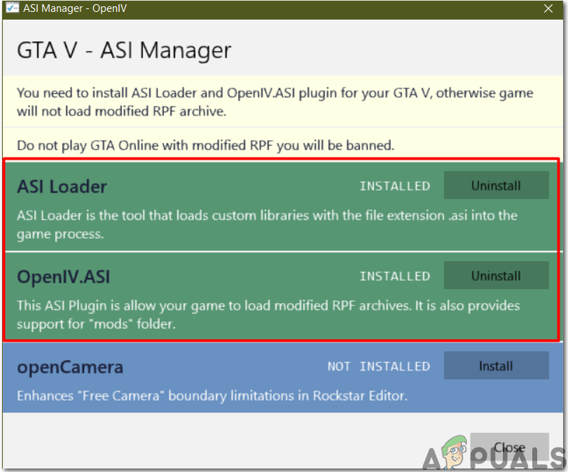 The ASI Loader and OpenIV plugins need to be installed on your system otherwise the game will not load the modified RPF archive. We’ve already installed these plugins on our system hence, the Uninstall option is available for us. Click on the Install button and both these plugins will be installed on your respective systems.