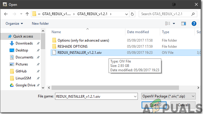 Locate the GTA_5_REDUX_V1.X.oiv file from the extracted GTA5 Redux download and then open the .oiv file to start the installation process.