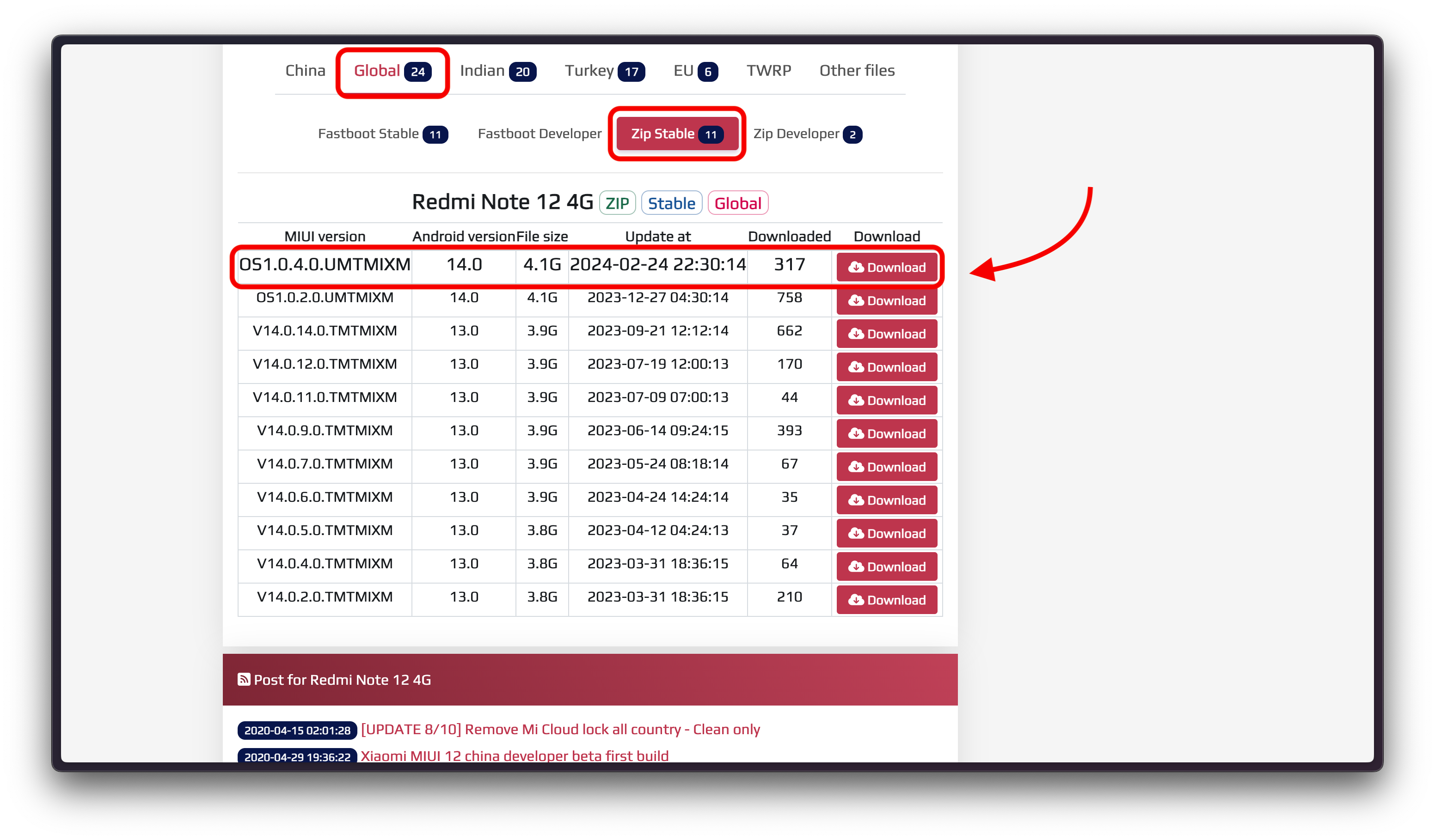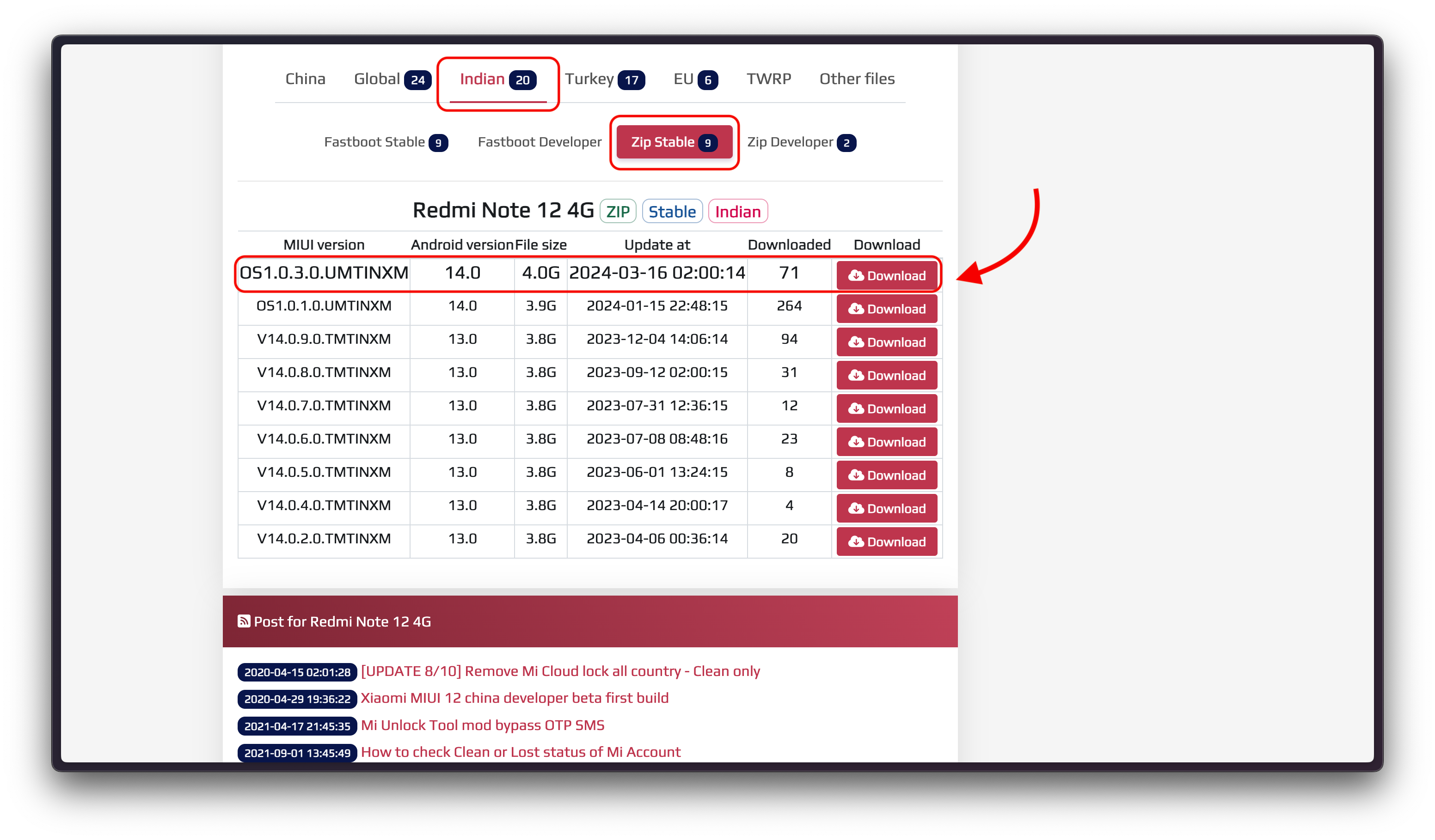 First, you need to download the required ROM files for installation. You will need two different files: one that matches your current region for authentication, and the other is the ROM for the region you wish to switch to. Ensure you download the Stable ZIP firmware, not the Fastboot file.