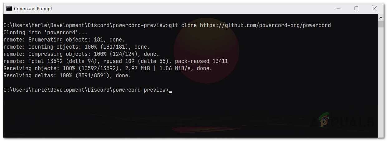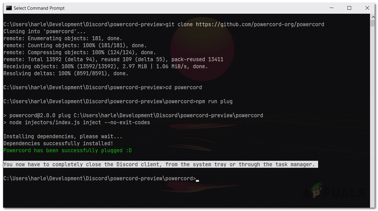 - Finally, type in the following command and hit the Enter key which will inject Powercord into the Discord Canary client: