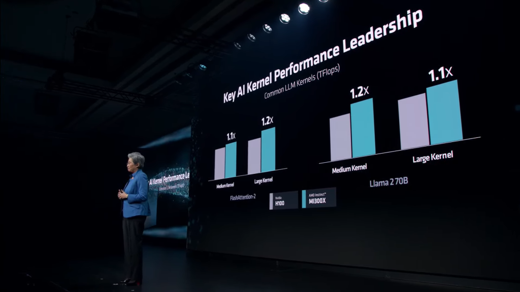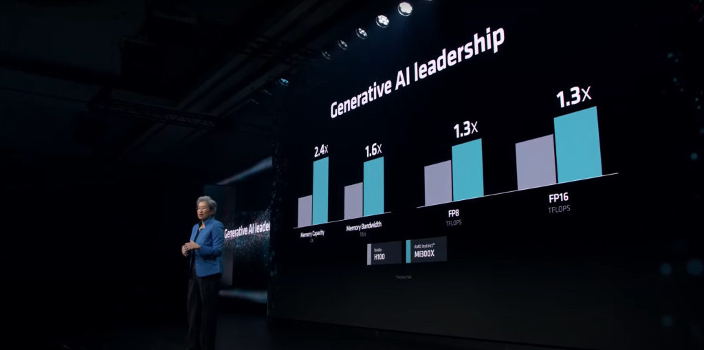 AMD promises 1.3 PetaFLOPS of FP16 performance and 2.6 PetaFLOPS of FP8 performance with the MI300X. Against NVIDIA’s Hopper-based H100, the MI300X is actually significantly faster in both FP16 and FP8 workloads. This lead extends to memory capacity and memory bandwidth, which is obvious, but plays a major role in LLM training.