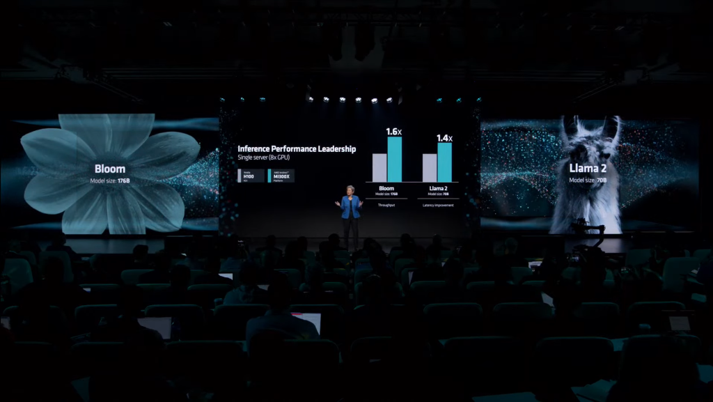 In AI Inference, the MI300X smokes NVIDIA’s H100 in both Llama and Bloom, which is the world’s largest multiple-language AI model. AMD is showing off pretty insane numbers, with up to 60% faster performance than NVIDIA.