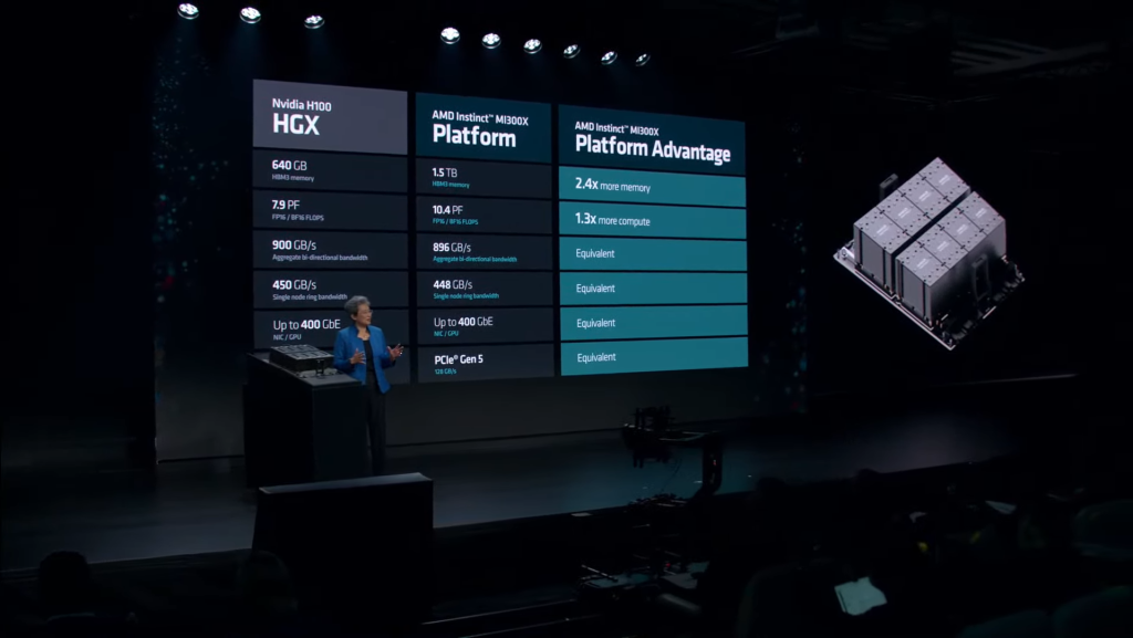 The MI300X platform supports all connectivity and networking capabilities that NVIDIA’s H100 HGX platform has. However, it has 2.4x more memory and 1.3x more compute power.