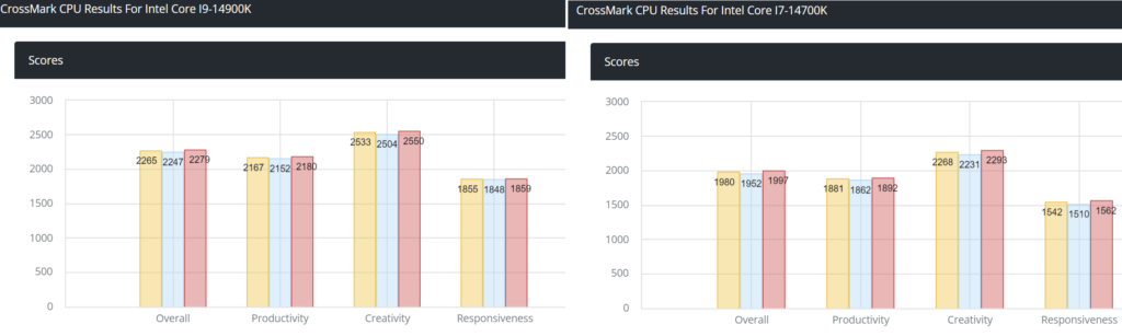 In CrossMark, both the i9-14900K and the i7-14700K were put to the test. The test bench features the RTX 4090 along with 16GB of DDR5-4800 memory. The slow memory will of course negatively impact the test results as you’ll see in a bit.