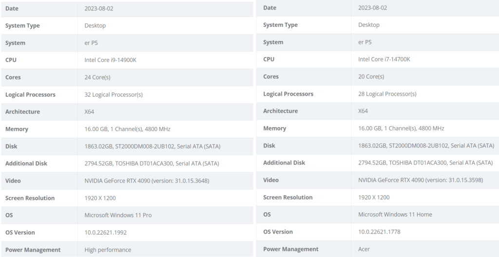 | i9-14900 | 24/32 | 5.8GHz | i9-13900 | 24/32 | 5.6GHz | ||||