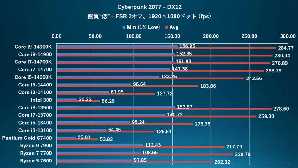 In Cyberpunk 2077, the lead is almost within the margin of error. I mean, it isn’t a surprise since both chips use the same underlying architecture. All modern AAA games require at least a hexacore processor and to prove our point, the i5-14400 scores 3.2x more FPS than the Intel 300.