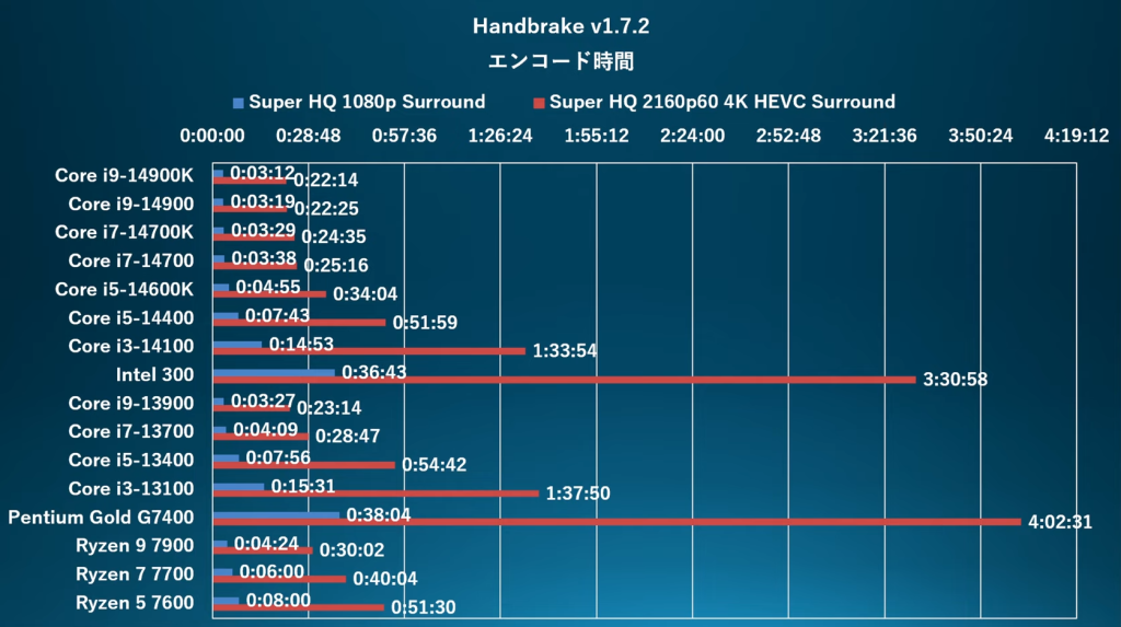 Handbrake is where many would panic after seeing the painstakingly long 3 hours and 30 minutes taken by the Intel 300, but that is still much better than the G7400’s 4 hours and 2 minutes. For context, the i9-14900 took just 22 minutes in the same test.