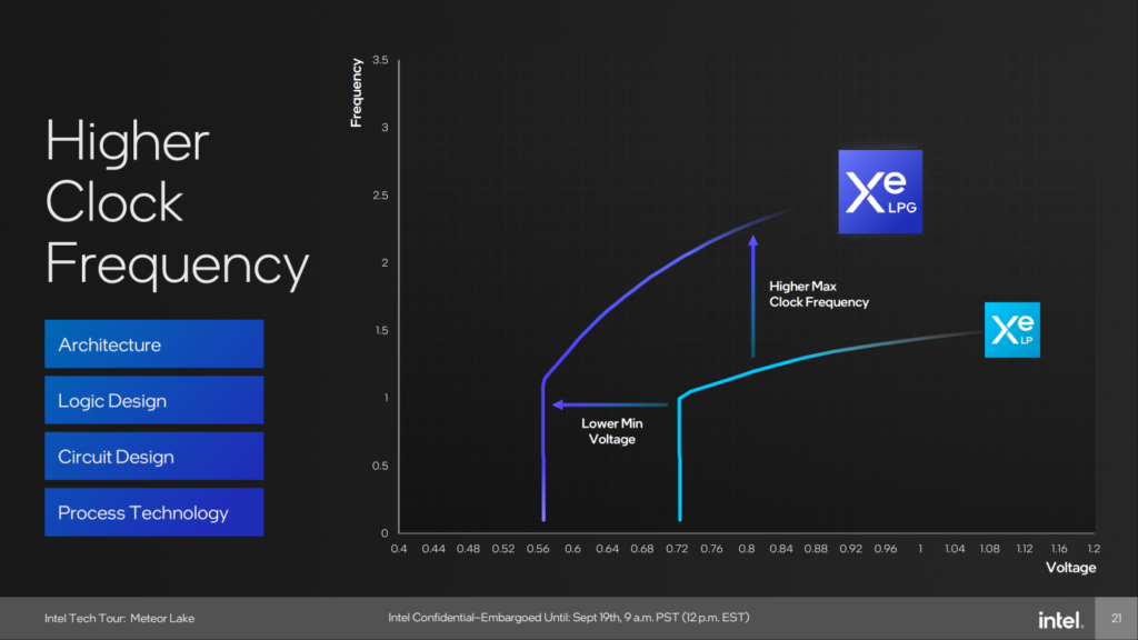 Meteor Lake will make use of Intel’s Xe-LPG architecture for its integrated GPU. Xe-LPG is a derivative of Alchemist, hence it inherits all the bells and whistles of Xe-HPG. A key feature of Meteor Lake’s iGPU is low-voltage operation and high-voltage for higher performance at the other end.