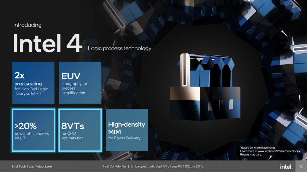 Meteor Lake uses the long-awaited ‘Intel 4’ node which is equivalent to TSMC’s N3 process, in terms of transistor density. However, we should point out that only the Compute Tile is manufactured on Intel 4. The rest of the CPU uses third-party nodes from TSMC.