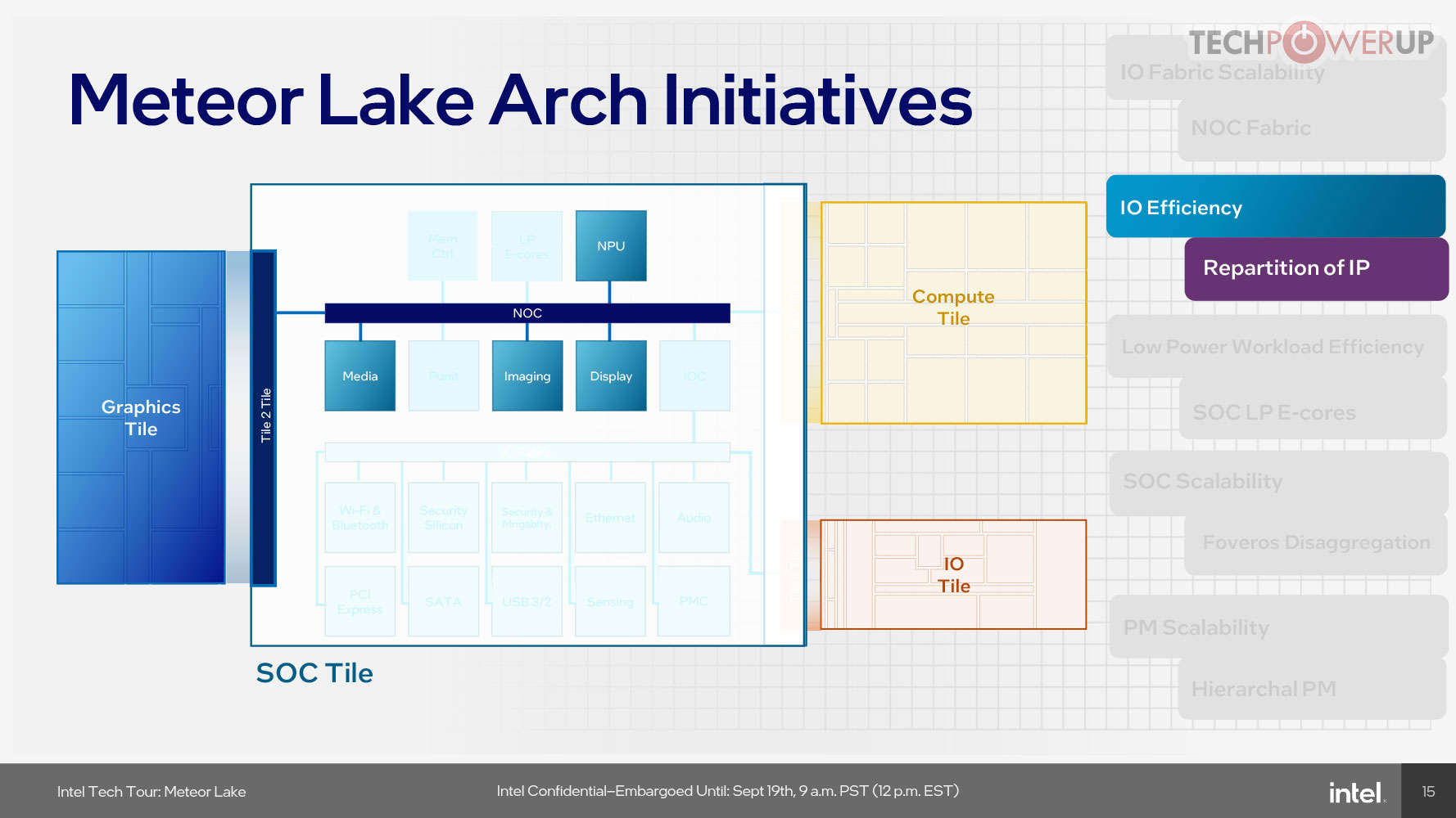 SoC Tile: The SoC Tile performs I/O functions similar to AMD’s IOD. Importantly, the SoC Tile integrates a VPU used for AI inference. This is Intel’s answer to Ryzen AI and will enable: Live Noise Suppression, Video Upscaling, Auto-Framing etcetera, offloading the burden from the CPU. It also packs the Media Accelerator, the Image Processing Engine and the Display Controller.