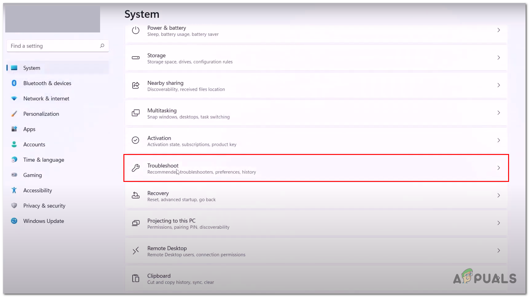 Opening settings in windows 11 - Under the System settings tab, locate Troubleshoot option as shown in the image and open it.