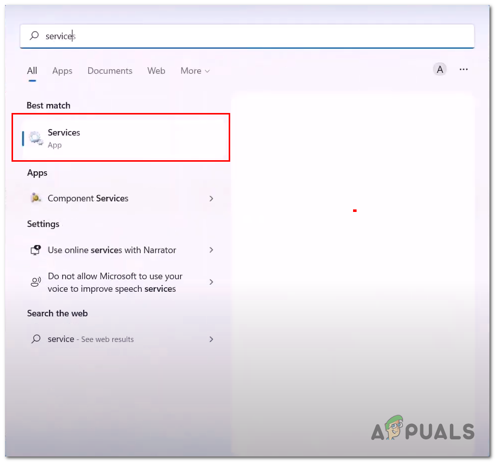 - On your keyboard, press the Windows key to open the windows startup menu, and in the search bar, type Services.