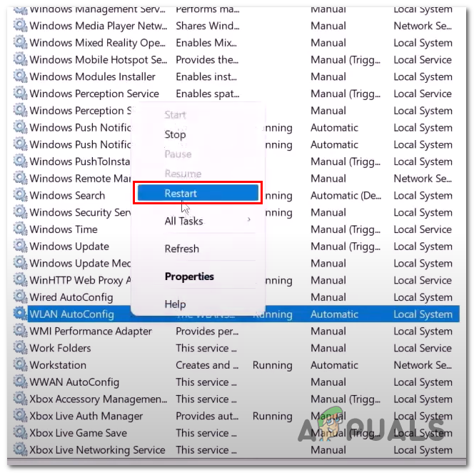 - Now, Right-Click on the WLAN Autoconfig service again and Click on restart.