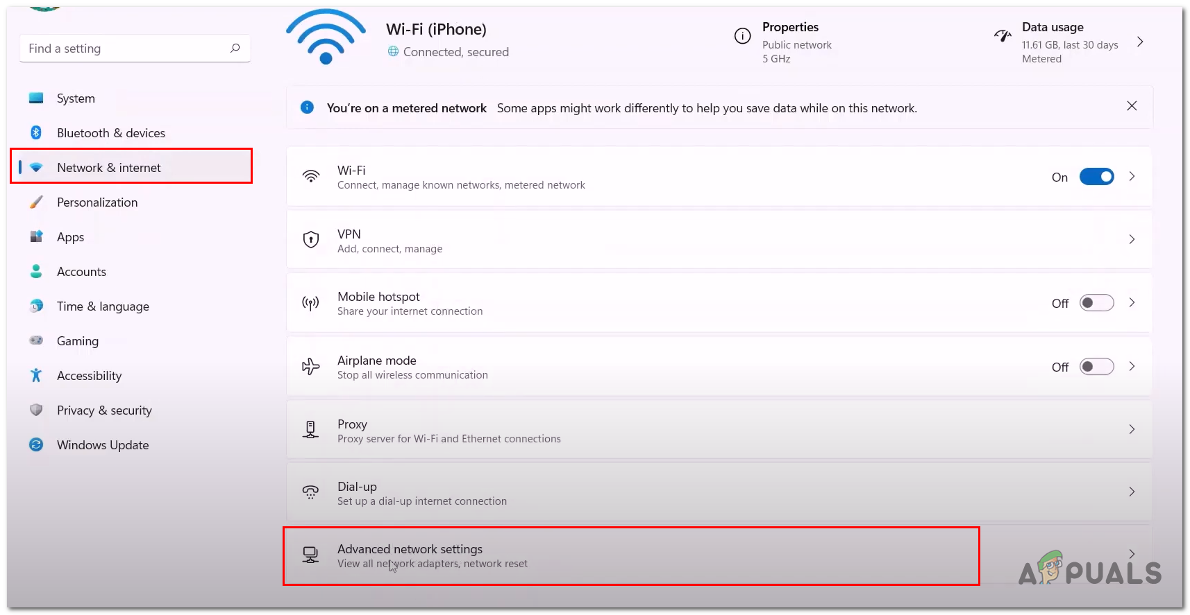 - At the bottom of the window, Click on Advanced network settings as shown in the image.