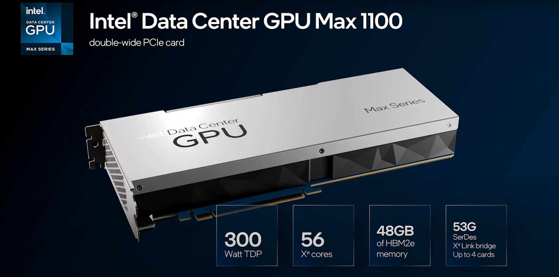 - Max Series 1100 GPU: A 300-watt double-wide PCIe card with 56 Xe cores and 48GB of HBM2e memory. Multiple cards can be connected via Intel Xe Link bridges.