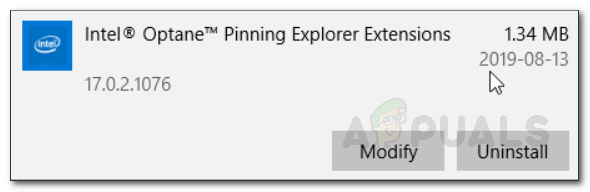 - This will take you to the list of installed applications on your system. There, search for ‘Intel Optane Pinning Explorer Extension’ and then highlight to reveal the Modify and Uninstall buttons.