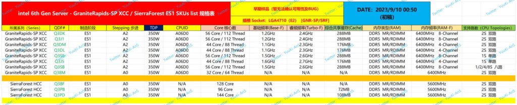 Granite Rapids on the other hand is Intel’s trump card against Genoa and the likes of Turin. These CPUs are currently marked ‘ES1‘ hinting that they are in their early development stages. The specifications are not exciting, thus far, as the highest-end configuration goes up to 56 cores.