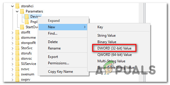 - Once you’re inside the correct location, right-click on Device, then choose New > Dword (32-bit) Value from the context menu that just appeared.
