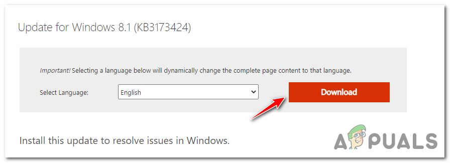 Downloading the KB3173424 update for Windows 8.1 - Once you get to the next screen, select the language that you want to use for the update installer, then click the download button to initiate the procedure.