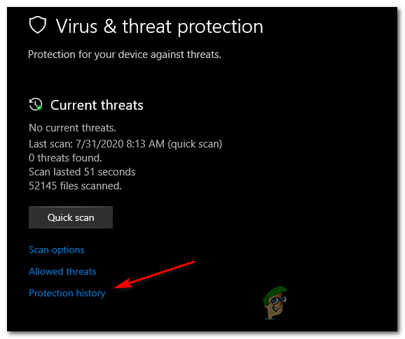 Accessing the Virus and Threat Protection - Once you’re inside the Virus and Threat protection menu, click on Protection history (under the Quick Scan button)