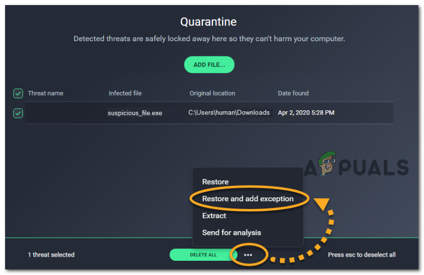 Note: On AVG, you can do this by opening the AVG app and going to Menu > Quarantine tab > click on r5apex.exe, click on the drop-down tab by the yellow delete button, then click on Restore and add exception.