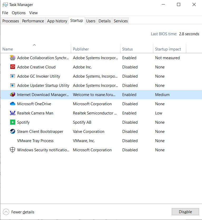 Startup - Under Startup in Task Manager, for each startup item, select the item and then select Disable at the bottom of the application.