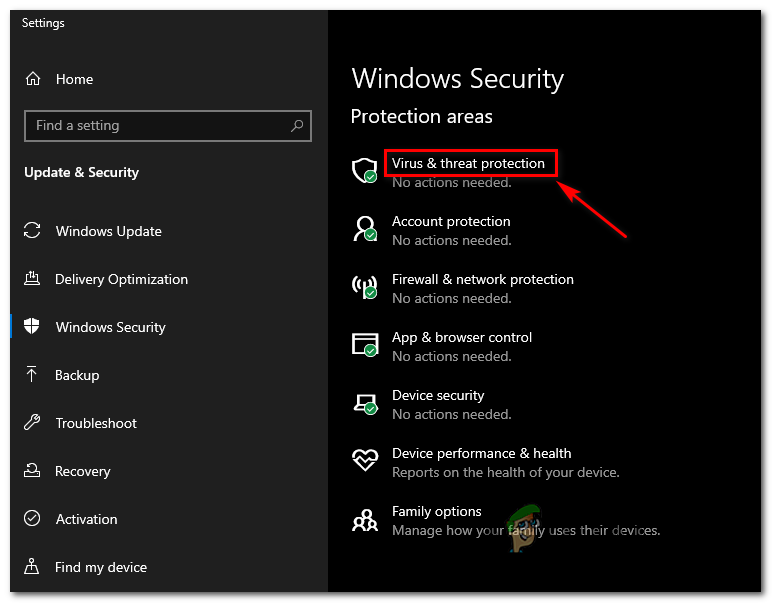 Run dialog: ms-settings:windowsdefender - Once you’re inside the Windows Security menu, use the menu on the left to click on Virus & Threat Protection.