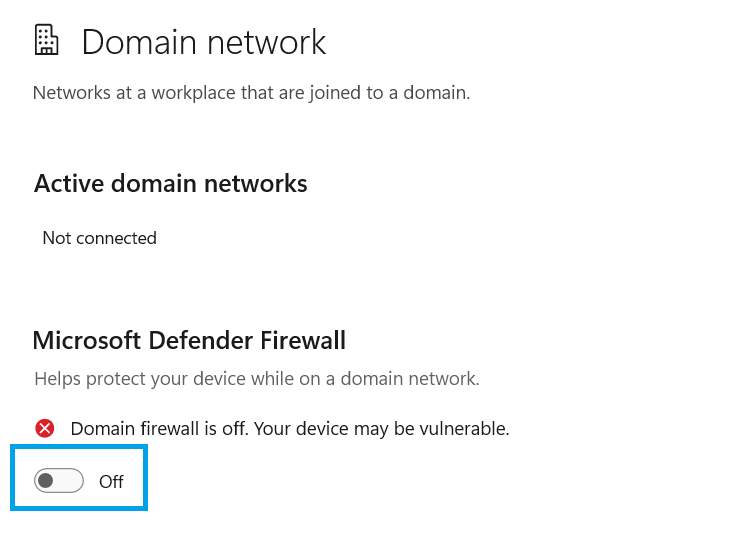- Turn off the Microsoft Defender Firewall.