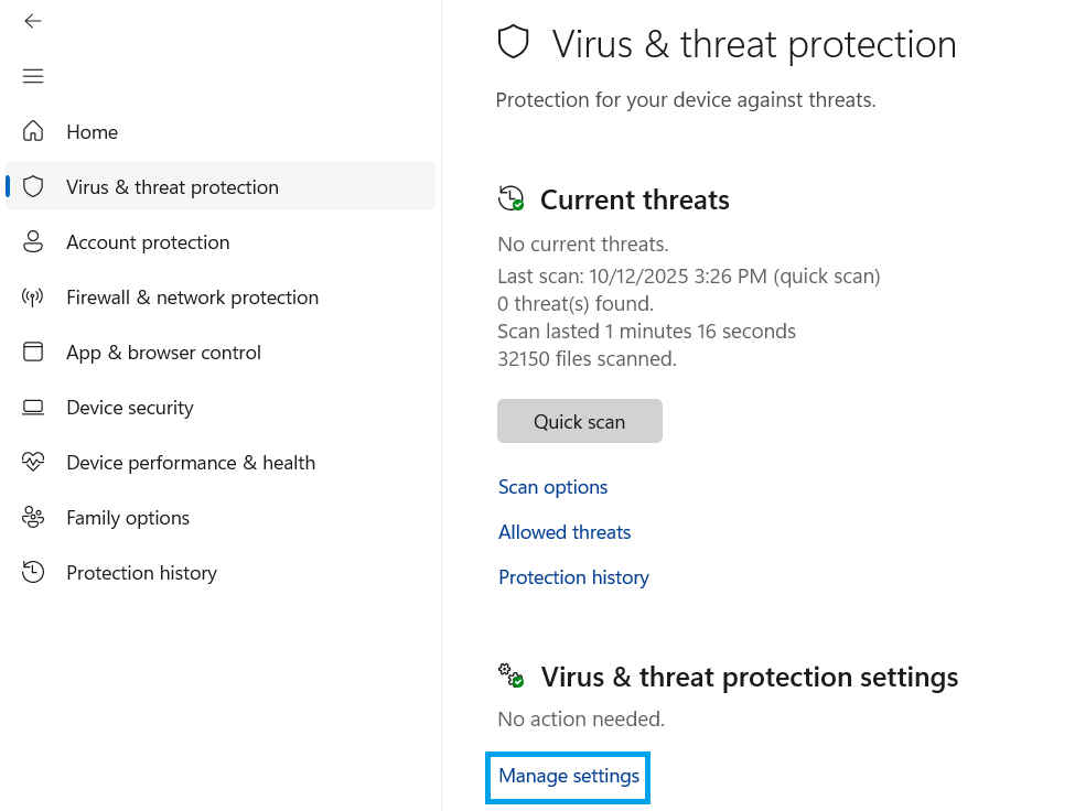 - Go to Virus & threat protection.