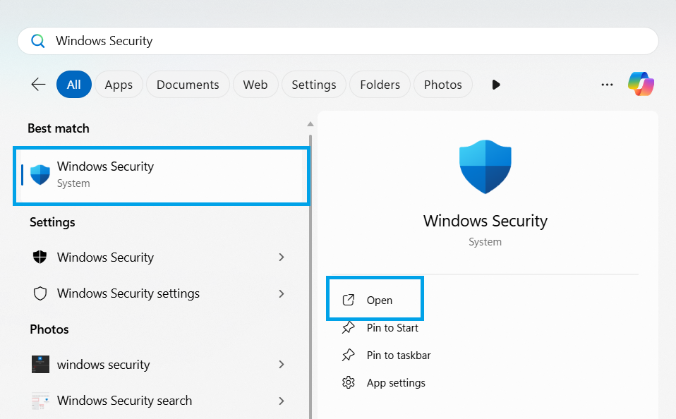 - Press Win + S and search for Windows Security.