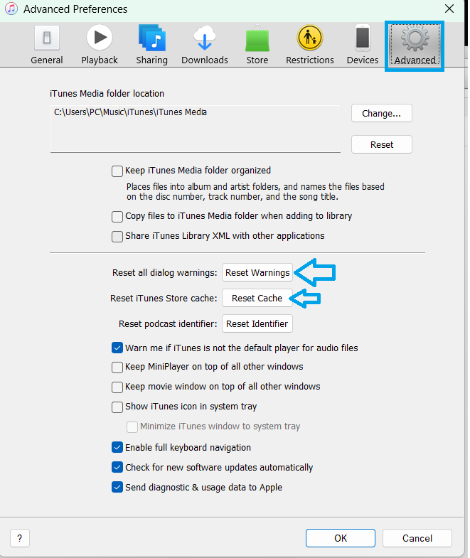 - Under the Advanced tab, click both Reset Warnings and Reset Cache.
